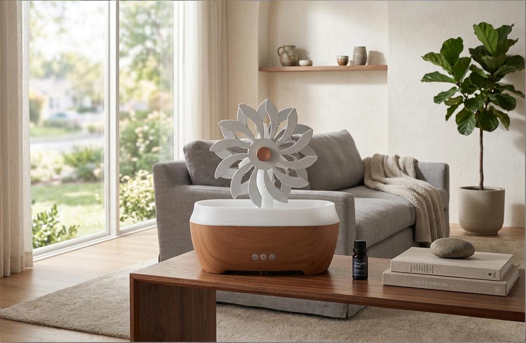 Hydrodynamic Internal Structures: Because USB fans are smaller, the internal “chimney” of the diffuser must be mathematically optimized. We use laminar flow simulations to ensure the mist is projected vertically, preventing moisture from settling on sensitive electronic equipment—a critical feature for desktop use.
