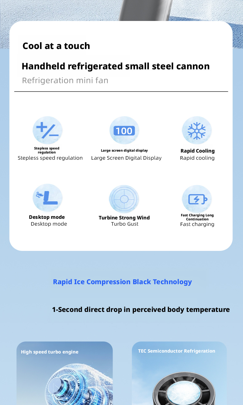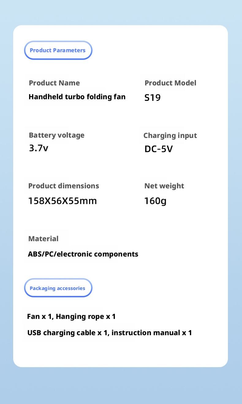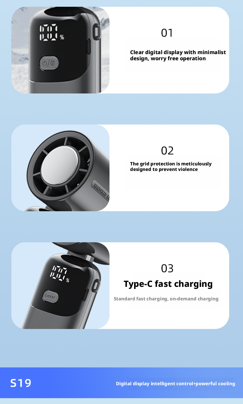 We are a professional OEM/ODM manufacturer specializing in the S19 foldable turbo handheld fan, providing full customization services for global home appliance brands, Amazon sellers, and DTC independent brands. We support custom logo printing, exclusive private label design, personalized appearance and packaging development, as well as complete CE, FCC and RoHS certification to meet market access requirements. With stable mass production capacity, strict quality control system and mature supply chain management, we help brand owners build unique cooling product lines, enhance brand image and market competitiveness, and achieve long-term stable cooperative development.
