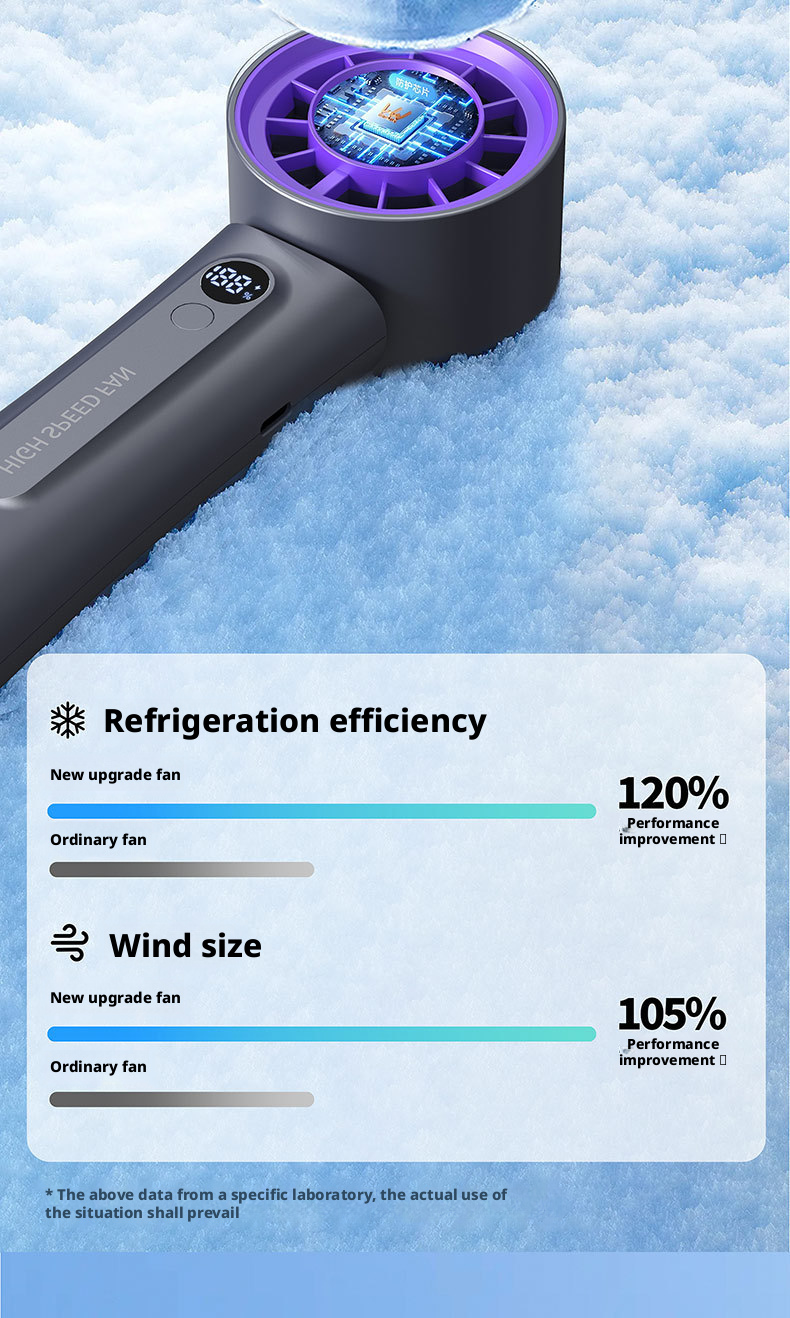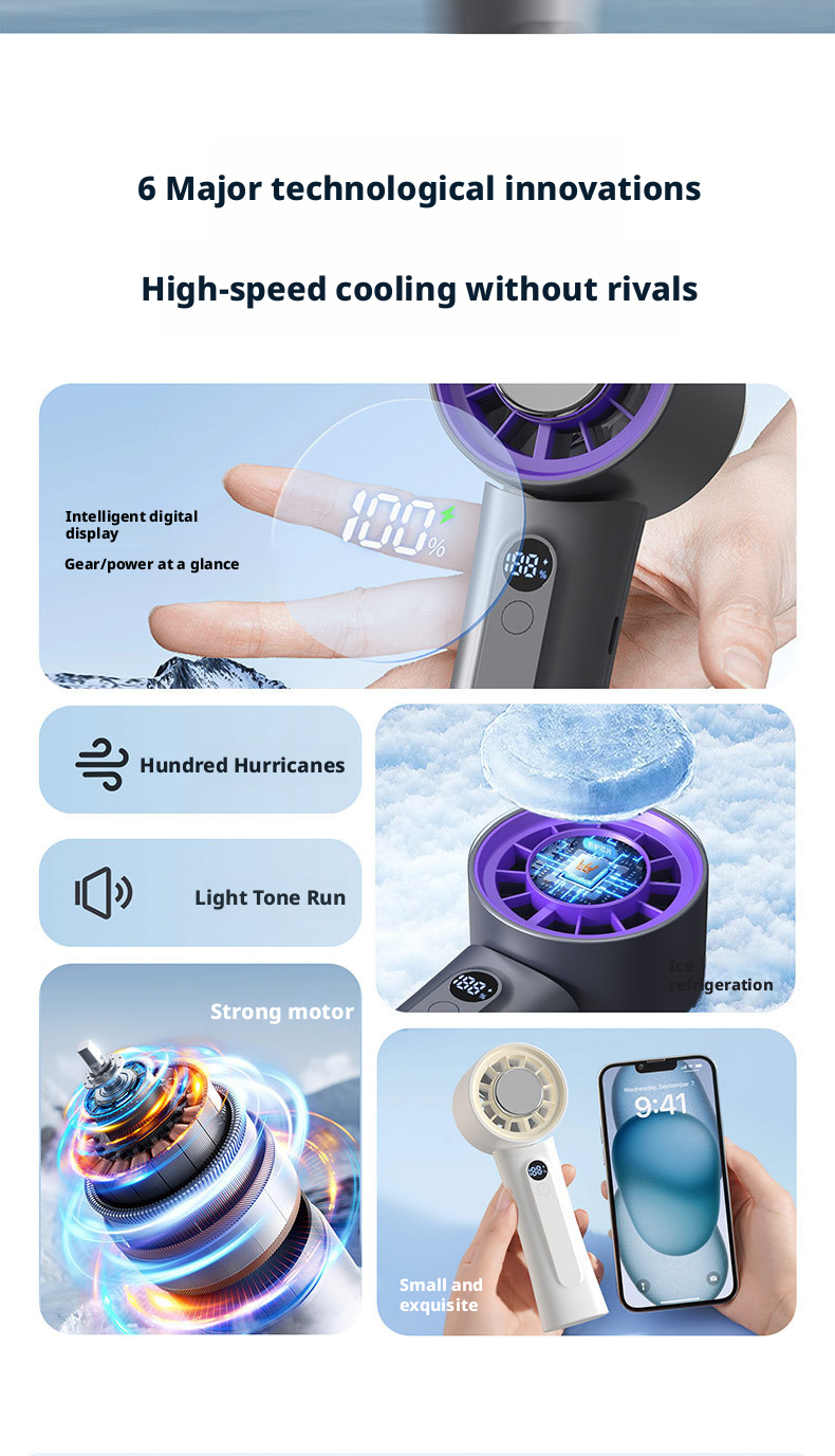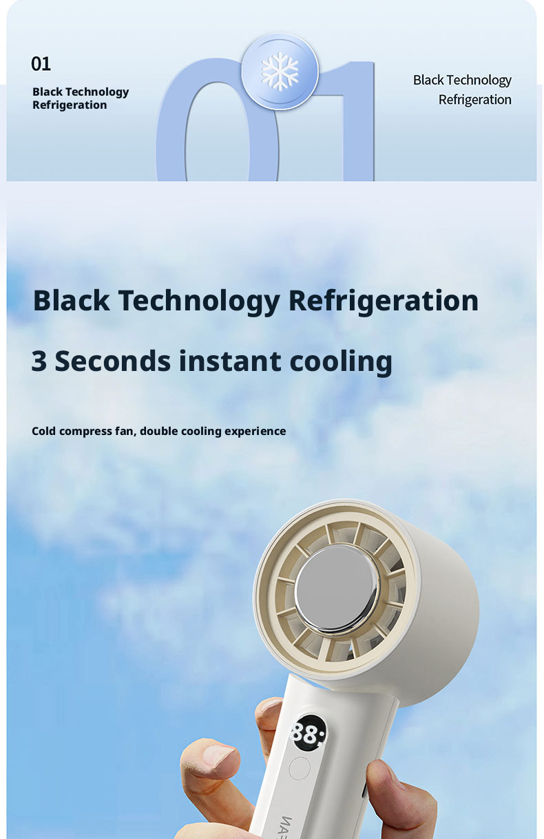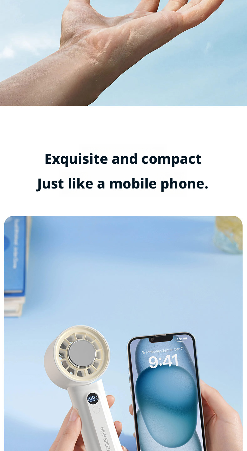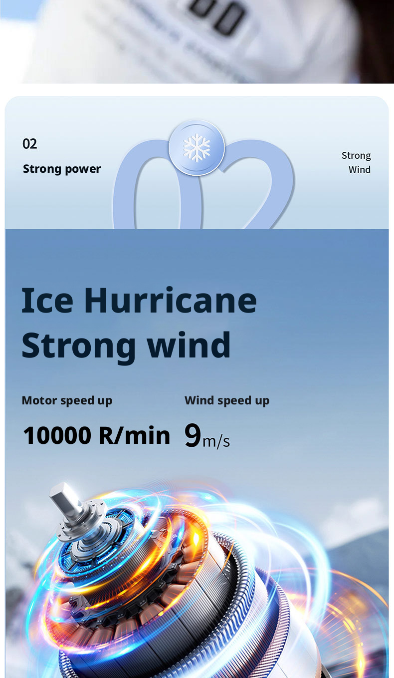 The HX-F326 represents a new peak of majestic wind power, engineered to deliver hurricane-level airflow with instant ice compress cold sensation. Powered by a 3000mAh 21700 high-capacity rechargeable battery, this fan provides ultra-long-lasting runtime, while its 100-level wind adjustment lets users precisely control cooling intensity for personalized comfort.