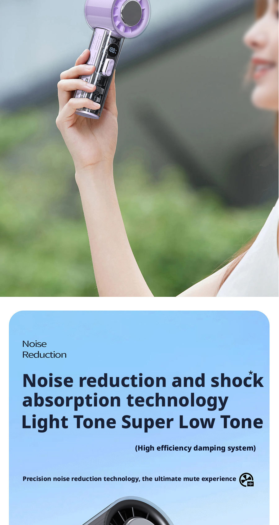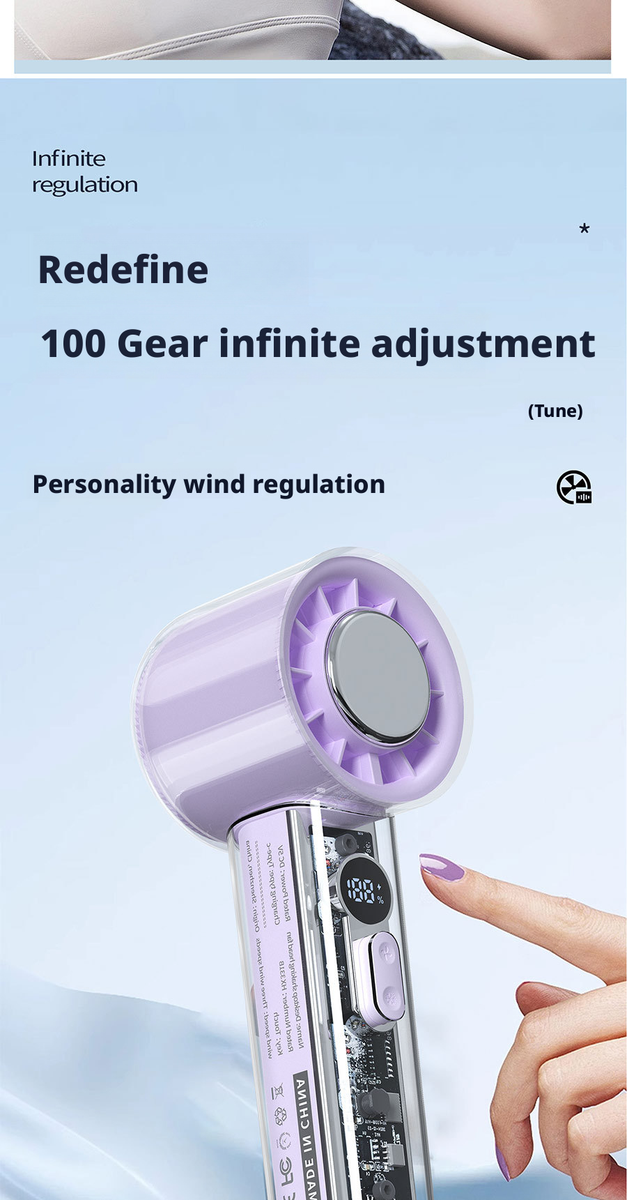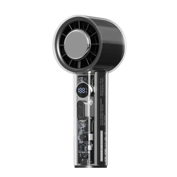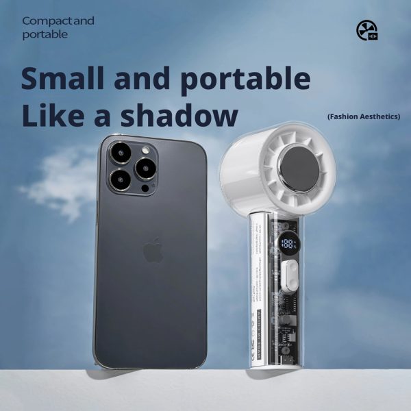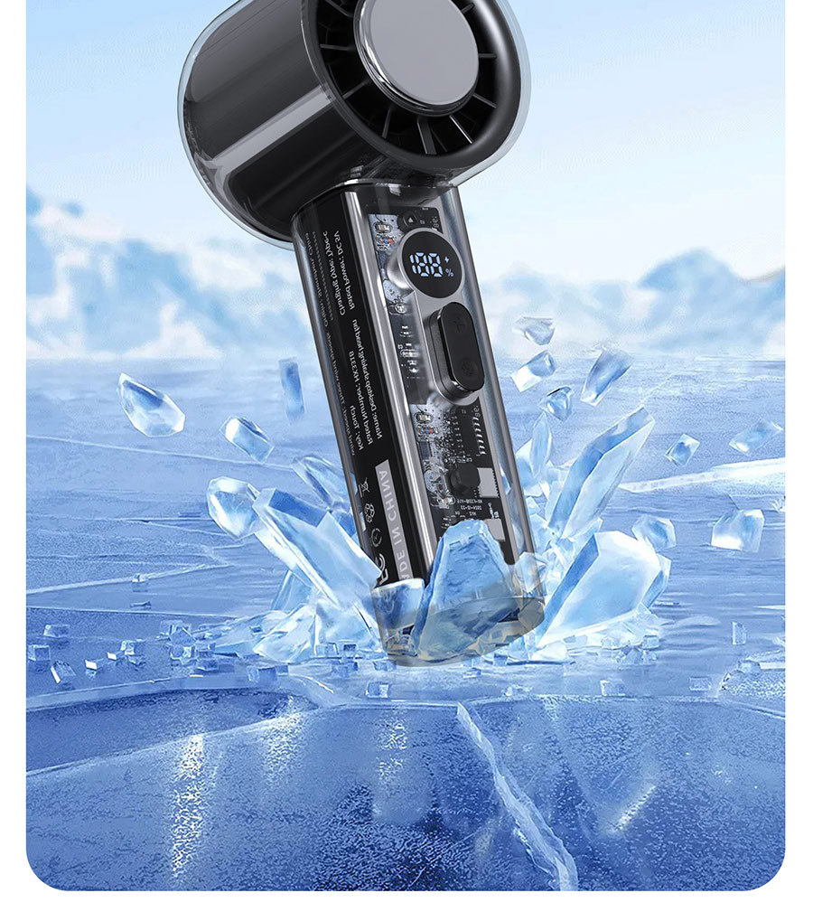 Featuring a sleek transparent body design (5955152mm) and an intelligent digital display for real-time power monitoring, this fan combines futuristic aesthetics with intuitive, user-friendly operation. Weighing only 204g, it is ultra-portable and comfortable to hold for extended use. Available in three stylish color options—Off-white, Dark Gray, and Purple—it caters to diverse aesthetic preferences and market demands.
