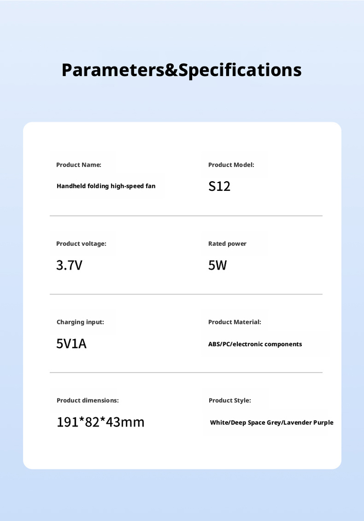 We provide customized OEM solutions of S12 foldable handheld fan for hotel apartments, medical and maternal institutions, real estate supporting projects and outdoor engineering procurement. The product has reliable quality, low failure rate, 3600mAh large battery, foldable design, digital display and convenient lanyard, which is suitable for long-term use in public service scenarios. We have the ability to meet high-standard technical requirements, support parameter adjustment, appearance optimization and supporting customization according to project needs. With long production cycle coordination ability, stable batch supply capacity and perfect after-sales service, we can meet the procurement needs of large-scale projects and establish long-term and stable cooperative relations with project contractors and institutional purchasers.