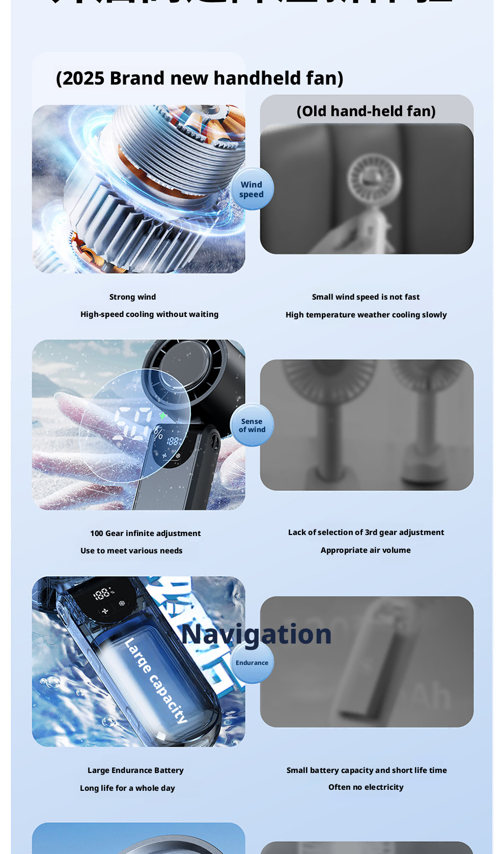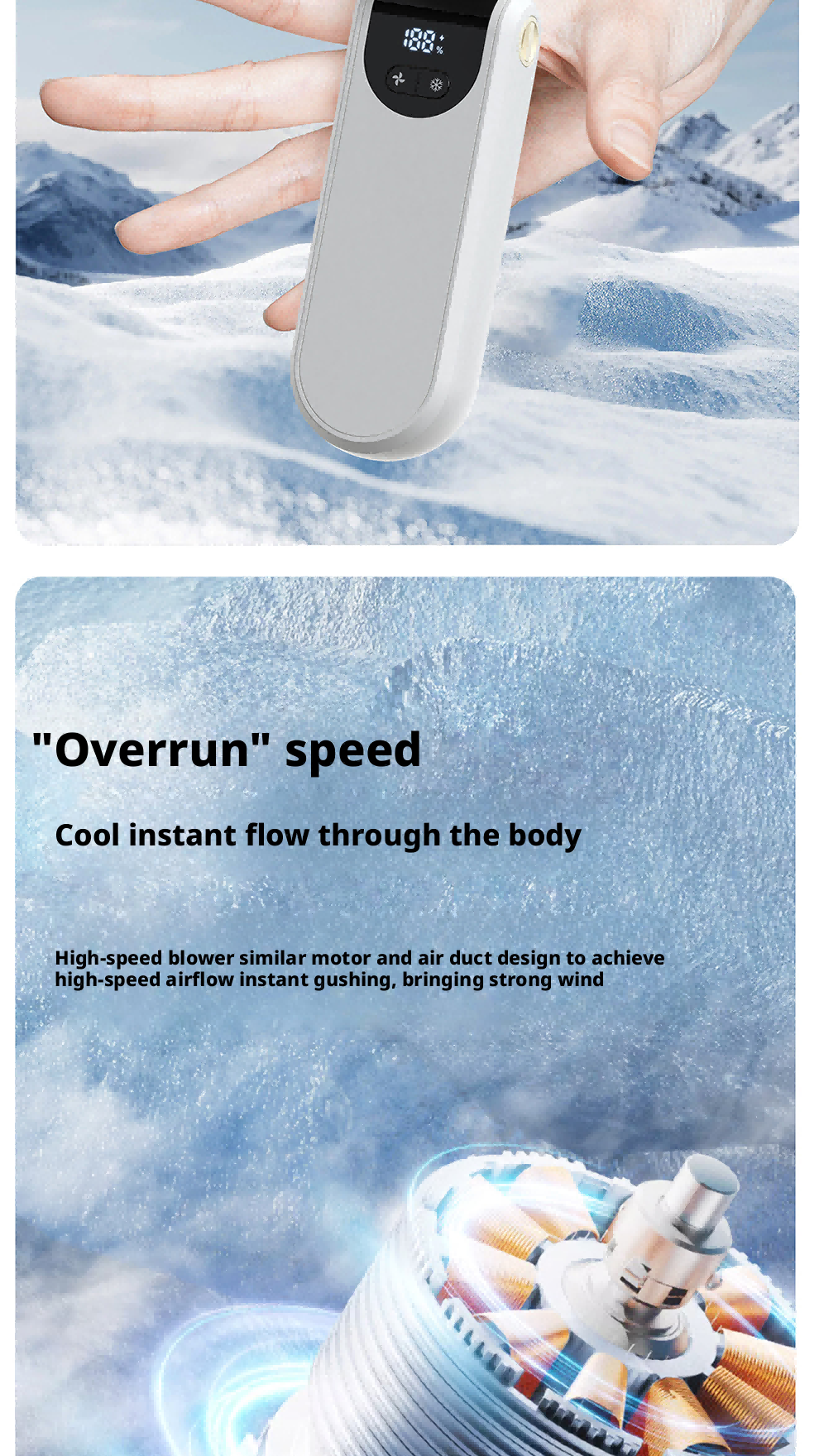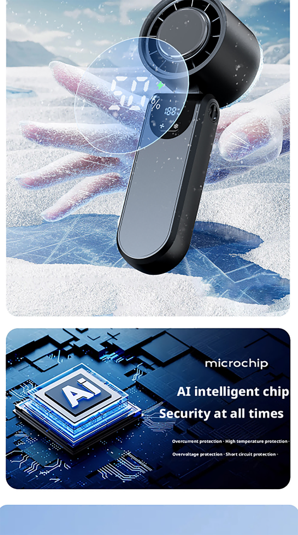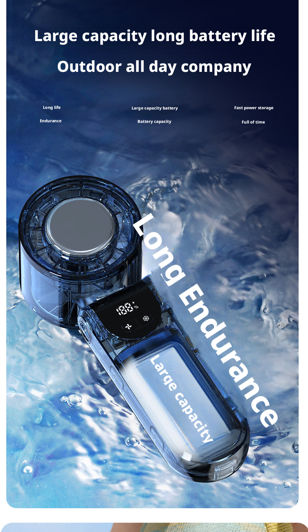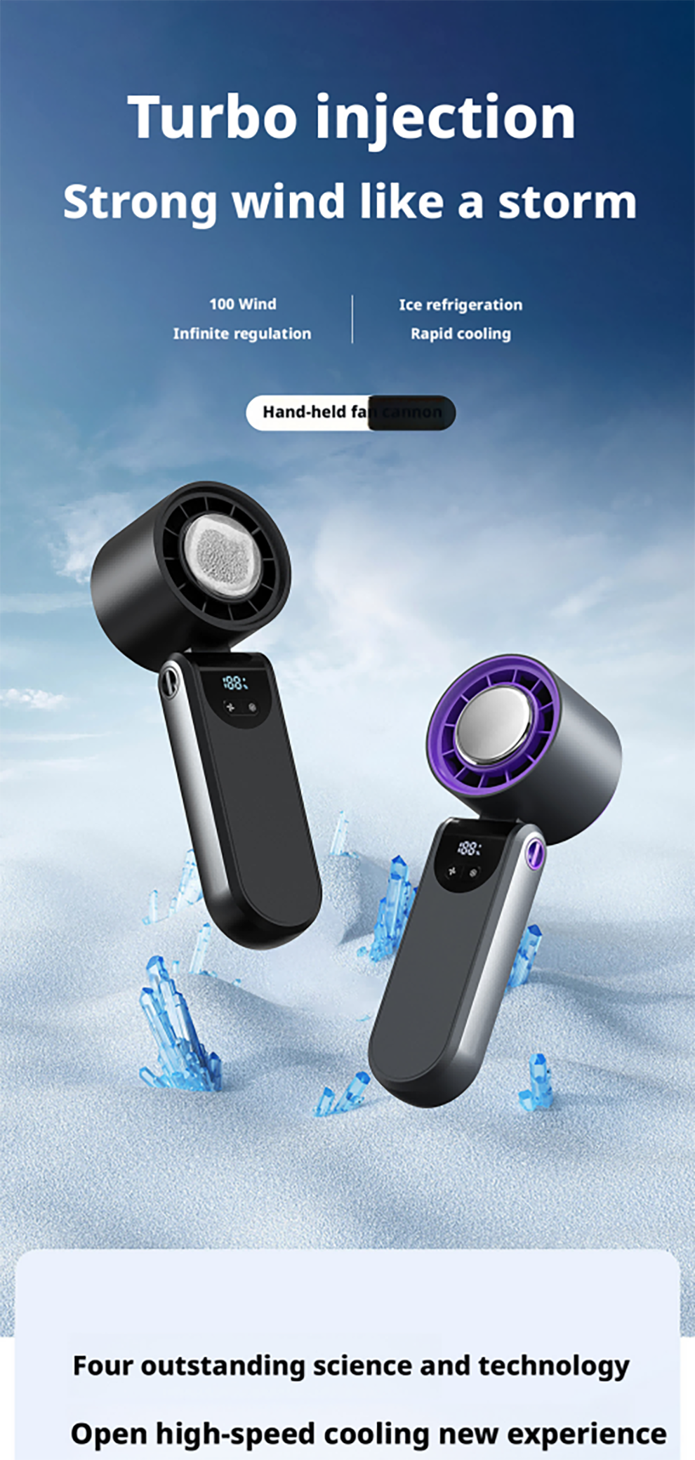 The HX-F330 is a factory-direct turbojet handheld fan, engineered to deliver storm-level strong wind with instant ice-sensing cooling. Powered by a 4000mAh 18650(2P) dual-cell high-capacity battery, this fan provides ultra-long-lasting runtime for all-day cooling, even in extreme heat.