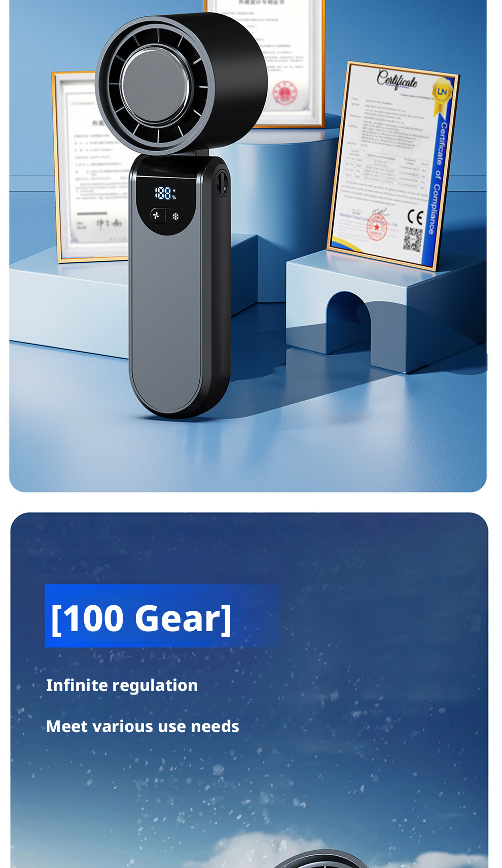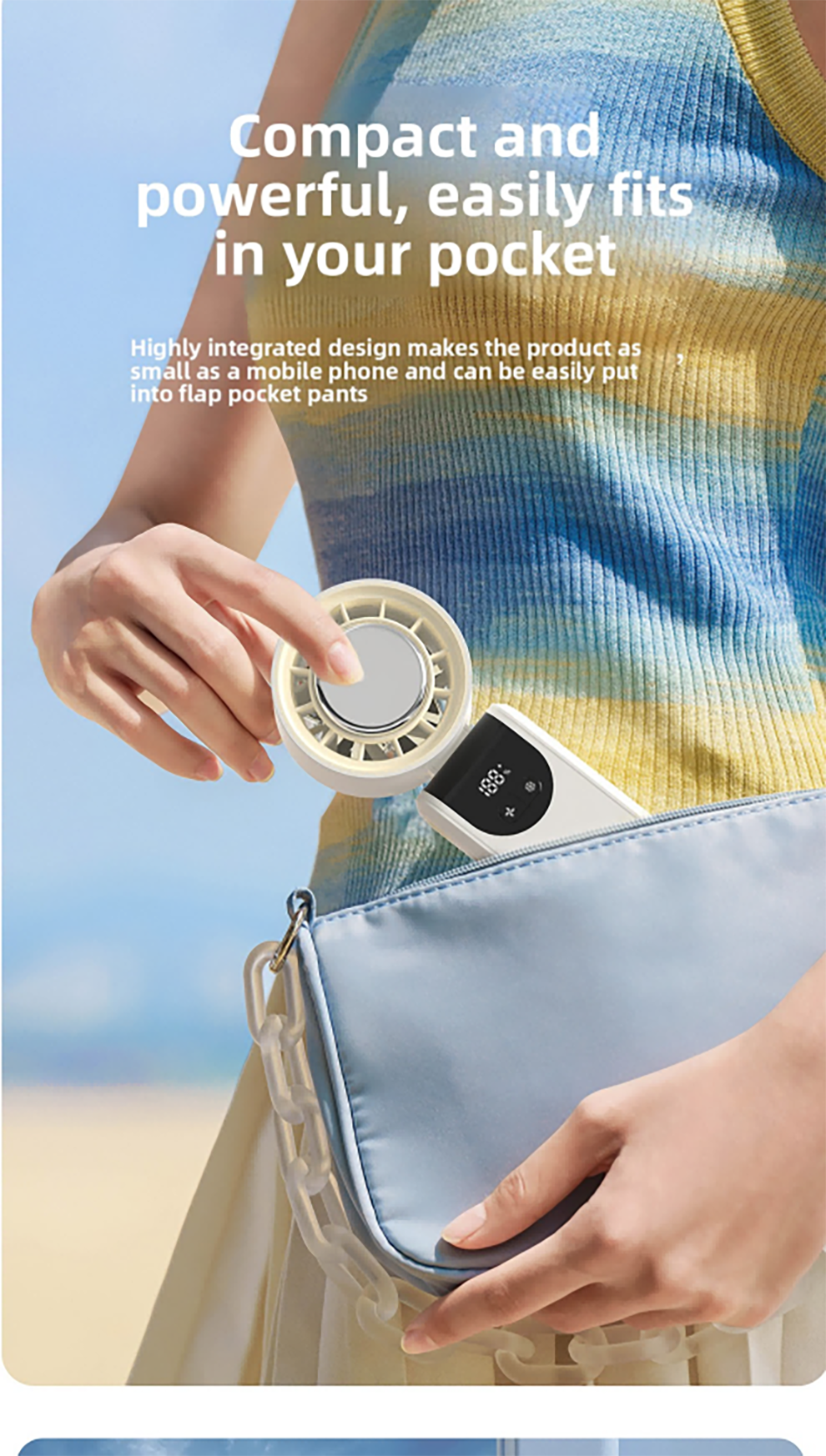 Featuring a practical lanyard design, built-in digital display for real-time power monitoring, and adjustable wind speed, it offers ultimate portability and intuitive control. With a sleek, ergonomic design (1776154mm) and three stylish color options—Beige, Black, Dark Gray—it combines powerful performance with modern aesthetics, perfect for commuting, office, travel, camping, and outdoor activities.