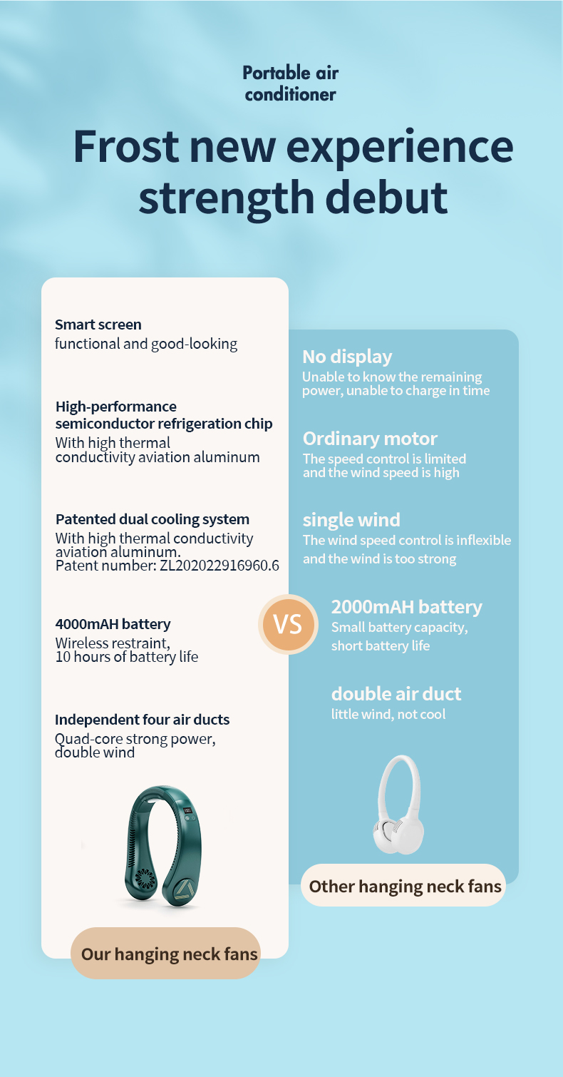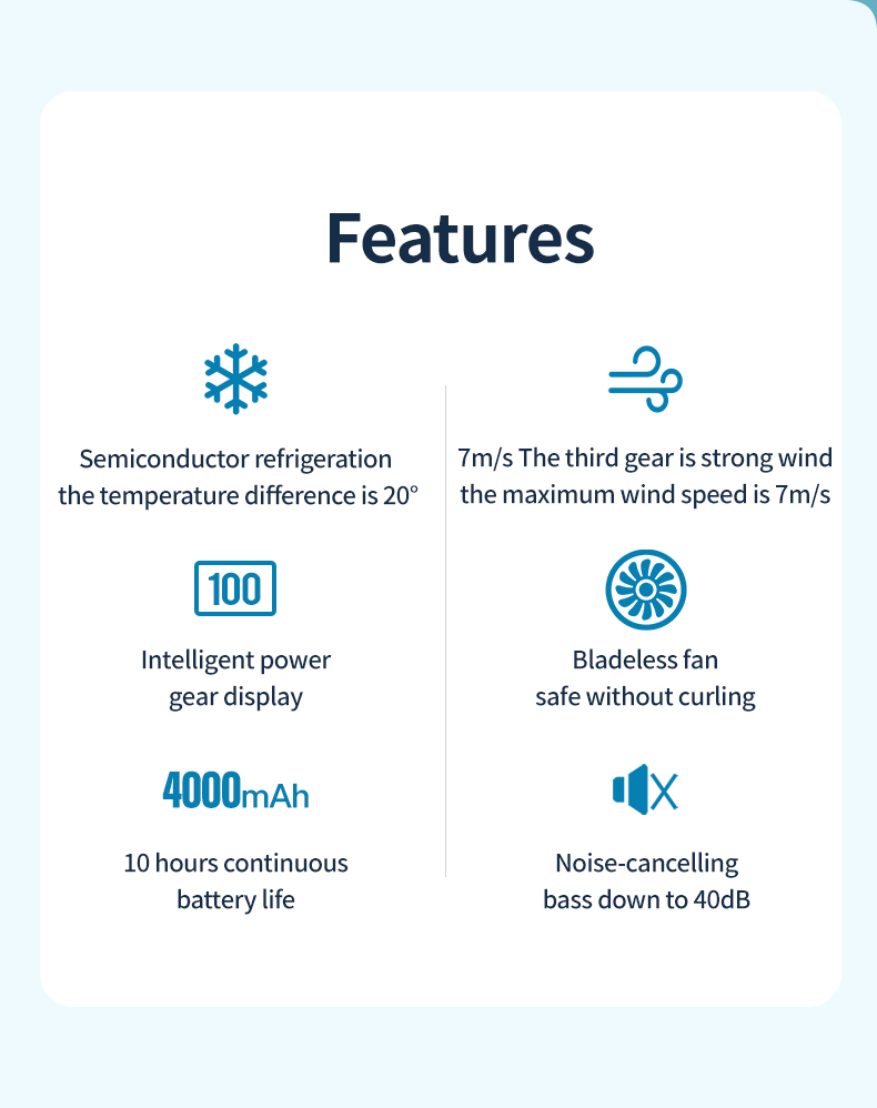 We are a professional manufacturer of the J01 upgraded refrigeration neck hanging fan, a high-performance wearable cooling solution with optional 4000mAh/6000mAh large-capacity battery, 10W power, 3 adjustable wind speeds with a clear digital display, 2-level adjustable cooling temperature of 15-20°C, 1.5-6 hours of runtime, and Type-C 2A fast charging, ideal for summer commuting, outdoor activities and daily use. As a reliable B2B factory, we serve all types of global business partners, including brand owners needing ODM/OEM customization, cross-border e-commerce sellers on Amazon/TikTok Shop/Temu requiring low MOQ and fast delivery, global importers and distributors seeking bulk supply and long-term cooperation, offline supermarkets and retail chains needing certified retail-grade products, gift companies and procurement teams for custom promotional gifts, and project clients for outdoor, commuting and daily life procurement. We offer full customization services, complete CE/FCC/RoHS certification, stable mass production capacity, competitive pricing, and one-stop after-sales support to meet the diverse needs of all our clients.